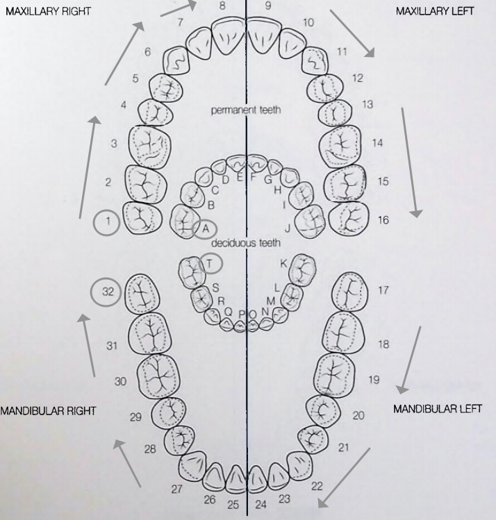 - 상악 우측 제3대구치를 1로 시작하여 하악 우측 제3대구치가 32가 되도록 시계 방향으로 번호 매기는 방법