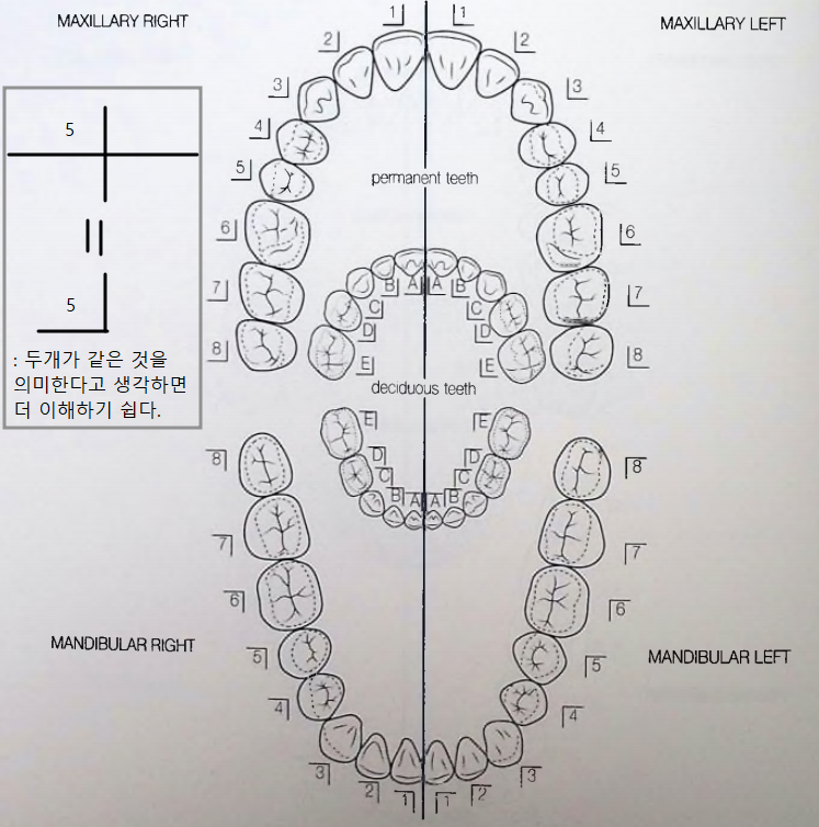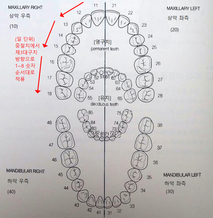 - 영구치: 상악 우측 - 10, 상악 좌측 - 20, 하악 좌측 - 30, 하악 우측 - 40