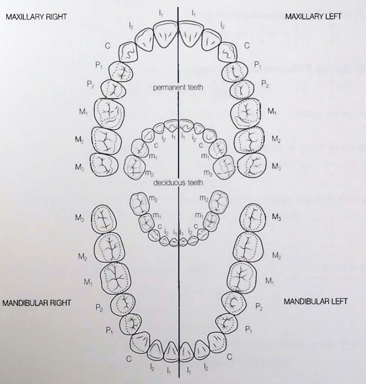 각 치아의 이름은 '상/하악 - 좌/우측 - 영구치/유치 - 치아 이름'의 순서로 부릅니다. 예를 들면, '상악 우측 중절치', '상악 우측 유중절치'와 같이 부르게 됩니다. 영어로 부르는 경우에는 '(permanent) maxillary right central incisor', 'primary maxillary right central incisor'와 같이 부르고 표기하게 됩니다. 영어와 한글의 순서에 약간의 차이가 있음을 알 수 있습니다.
